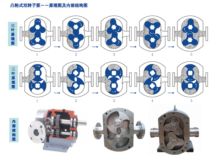 ?轉(zhuǎn)子泵又稱膠體泵,三葉泵,鞋底泵等。依靠兩同步反向轉(zhuǎn)動(dòng)的轉(zhuǎn)子(齒數(shù)為2-4)在旋轉(zhuǎn)過程中于進(jìn)口處產(chǎn)生吸力(真空度),從而吸入所要輸送的物料。兩轉(zhuǎn)子將轉(zhuǎn)子室分隔成幾個(gè)小空間,并按a→b→c→d的次序運(yùn)轉(zhuǎn)。運(yùn)轉(zhuǎn)至位置a時(shí),只有I室中充滿介質(zhì);?到位置b時(shí),B室中封閉了部分介質(zhì);?到位置c時(shí),A室中也封閉了介質(zhì);?到位置d時(shí),A、B室與Ⅱ室相通,介質(zhì)即被輸送至出料口。如此循環(huán)往復(fù),介質(zhì)(物料)即被源源不斷地輸送出。