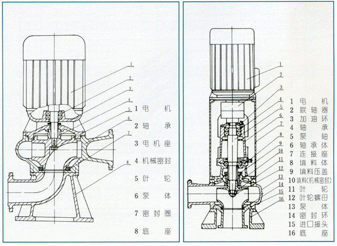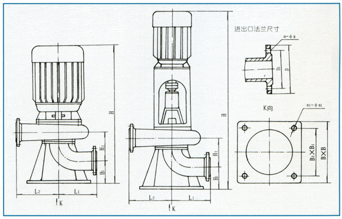 LW立式無堵塞排污泵為單吸蝸殼式泵,泵內(nèi)裝有無堵塞防纏繞型單(雙)大流道葉輪,具有很好的通過能力。該系列泵具有兩種結(jié)構(gòu)形式,一是電機與泵直接同軸,二是采用聯(lián)軸器聯(lián)接,電機采用標準立式電機。其結(jié)構(gòu)圖如下,每種結(jié)構(gòu)形式具有兩種底座連接形式,一是進口水平吸入,具有轉(zhuǎn)角功能,可根據(jù)使用要求,進出口安放成0°、90°、180°、270°,便于管路連接,二是進口軸向吸入,便于立式安裝。?