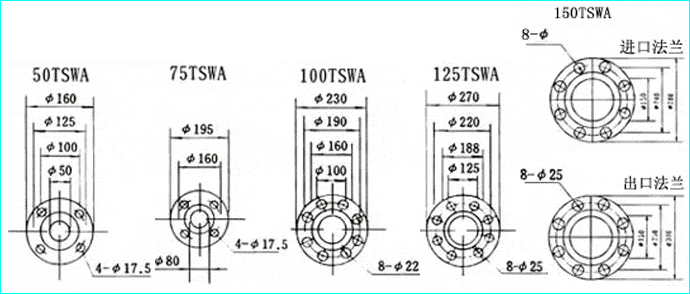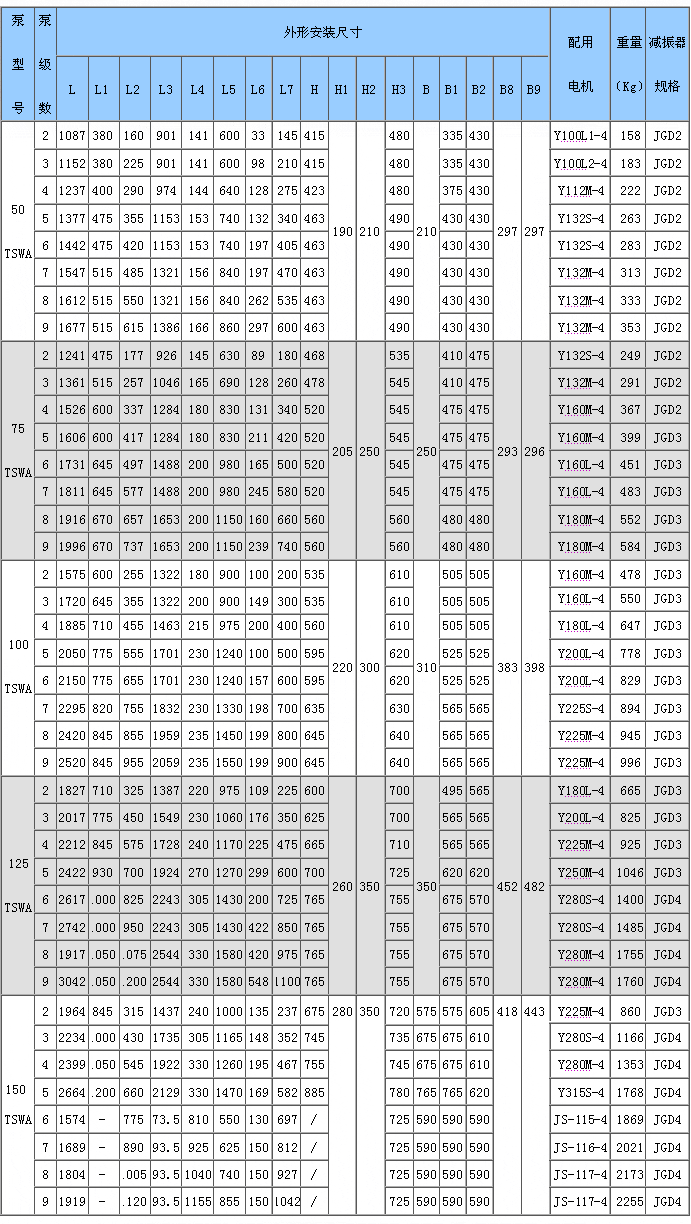 1、TSWA型臥式多級(jí)泵為多級(jí)節(jié)段式結(jié)構(gòu),其吸入口為水平方向,吐出口為垂直向上布置,設(shè)有50、75、100、125、150等口徑,用戶根據(jù)流量、揚(yáng)程的需求選擇不同品徑和級(jí)數(shù)的泵來得到滿足;??